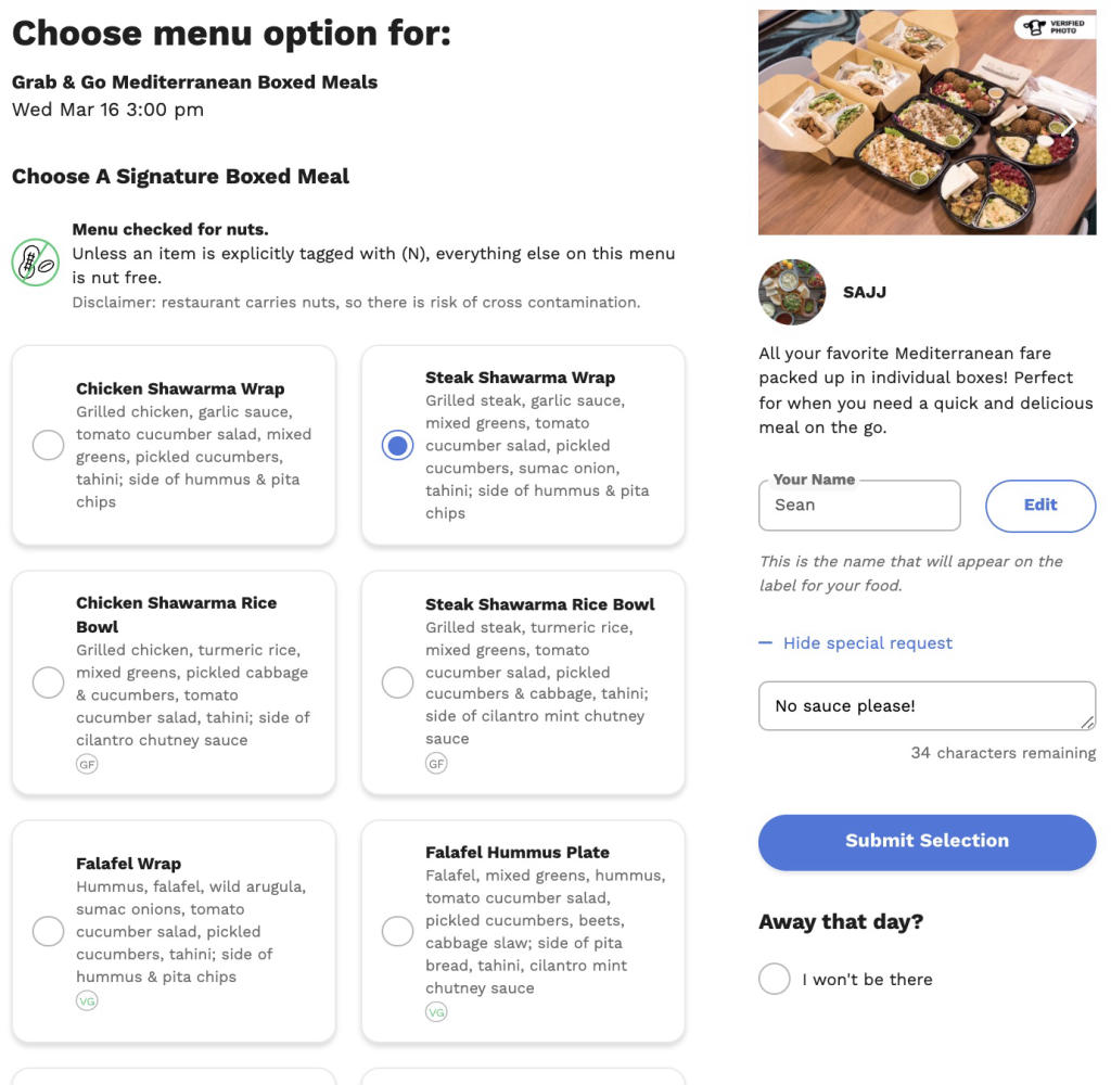 1. Employees choose what they want based on the restaurant selection of the day. Menu items come with dietary details, and you may also add special requests!