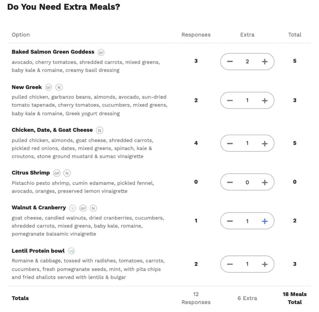 2. Want to account for stragglers and unexpected guests? Need to add a chicken burrito bowl labeled for your CEO? You can add meals on top of what your employees have chosen.